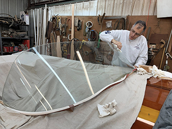 (Above) Alan Oppenheimer cleans a glass windshield donated by the late Glenn Nerwin. The guys are researching a way to mount the windshield to the Yellow Jacket. Any input?