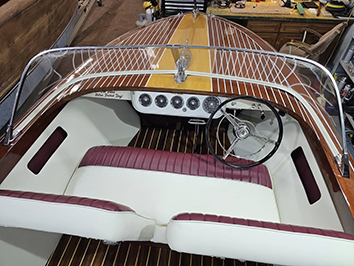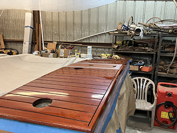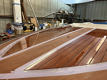 (Above) The aft deck of Carl's Super Sport is looking equally beautiful. Carl chooses varnishing days when others aren't around kicking up dust. Recent warm weather helped.